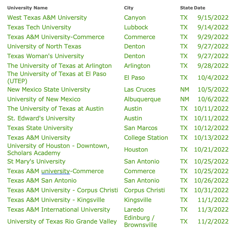 The Texas Swing calendar is a collaborative effort between the TACRAO Graduate and Professional School committee and TxGAP to help coordinate and organize information about graduate recruiting opportunities in Texas and New Mexico.